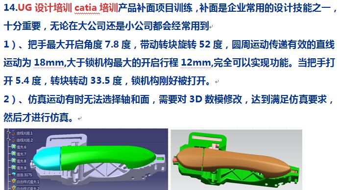 教学内容和训练项目包括:UG培训CATIA培训全能造型(图片造型+逆向造型+实物造型+照片造型+2D建3D+非参修改曲面和实体数据+钣金件造型+塑料件造型)+CATIA培训UG培训全能结构设计(逆向结构设计+正向结构设计+同步开发设计+创新性结构设计+产品改款结构设计+根据图片结构设计)+产品设计与模具设计关联+产品设计结构优化+运动件行程的计算和设计+补面和A面加料后+UG培训CATIA培训模具设计(学习各种经典的模具结构,包括斜顶结构、公模滑块、母模滑块、 母模斜顶、三板模结构设计、斜滑块结构设计、强脱模设计、二次成型等大量结构。)+UG培训CATIA培训仿真运动(常见的运动模拟)+IATF16949汽车体系(ots全部资料文件体系+PPAP全部的资料文件体系+PDS+APQP+DFMEA+DVP+实验大纲+技术协议等等)+前期技术方案的制作+CAD(全部熟练使用快捷键)+产品装配技巧(与书上装配完全不同,既快捷又简单尤其适合复杂的汽车零部件装配设计,同时还有利于后期参数修改)+材料迅速识别技巧和方法+塑料件与模具结构关系迅速判断法(塑料件上浇口位置、滑块位置、斜顶位置、顶针位置等等)+经典项目谈判案例